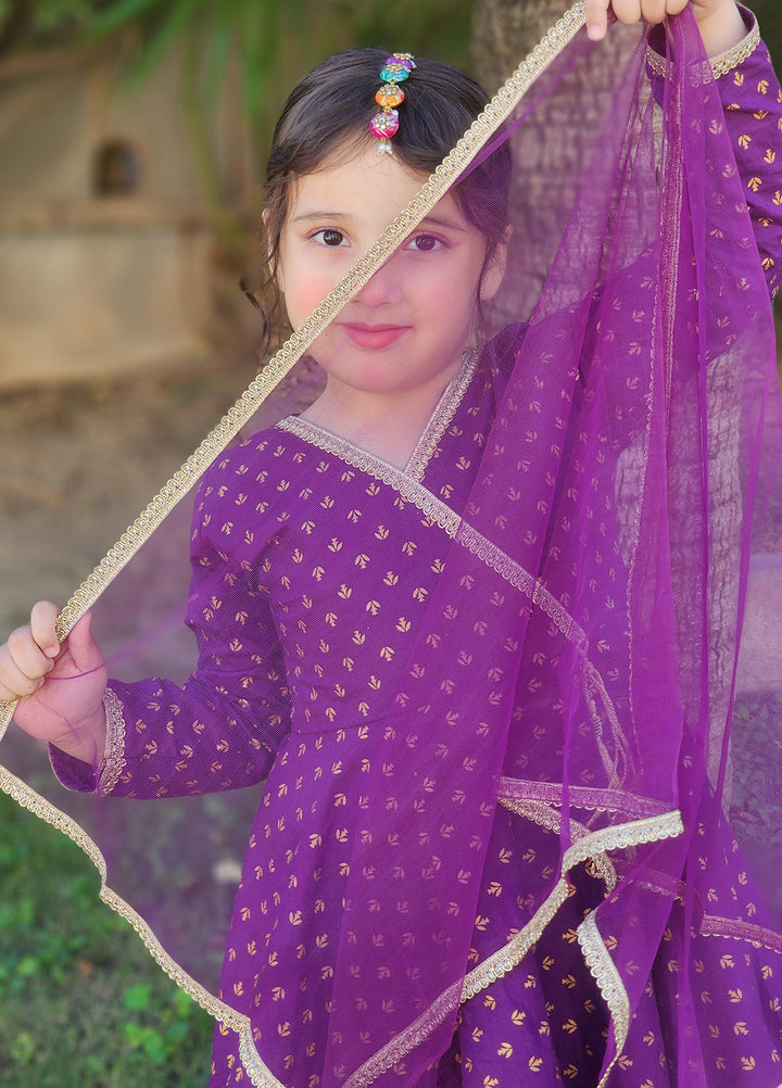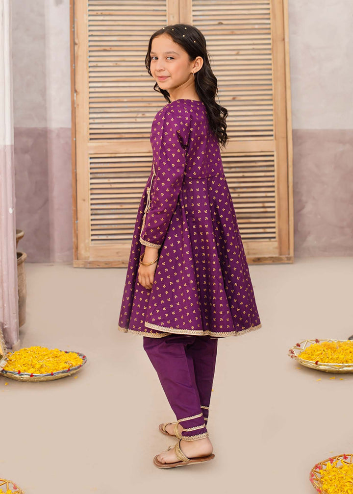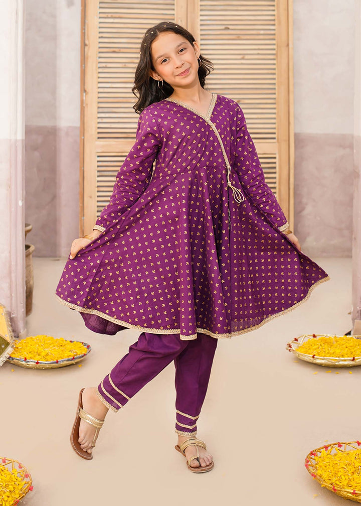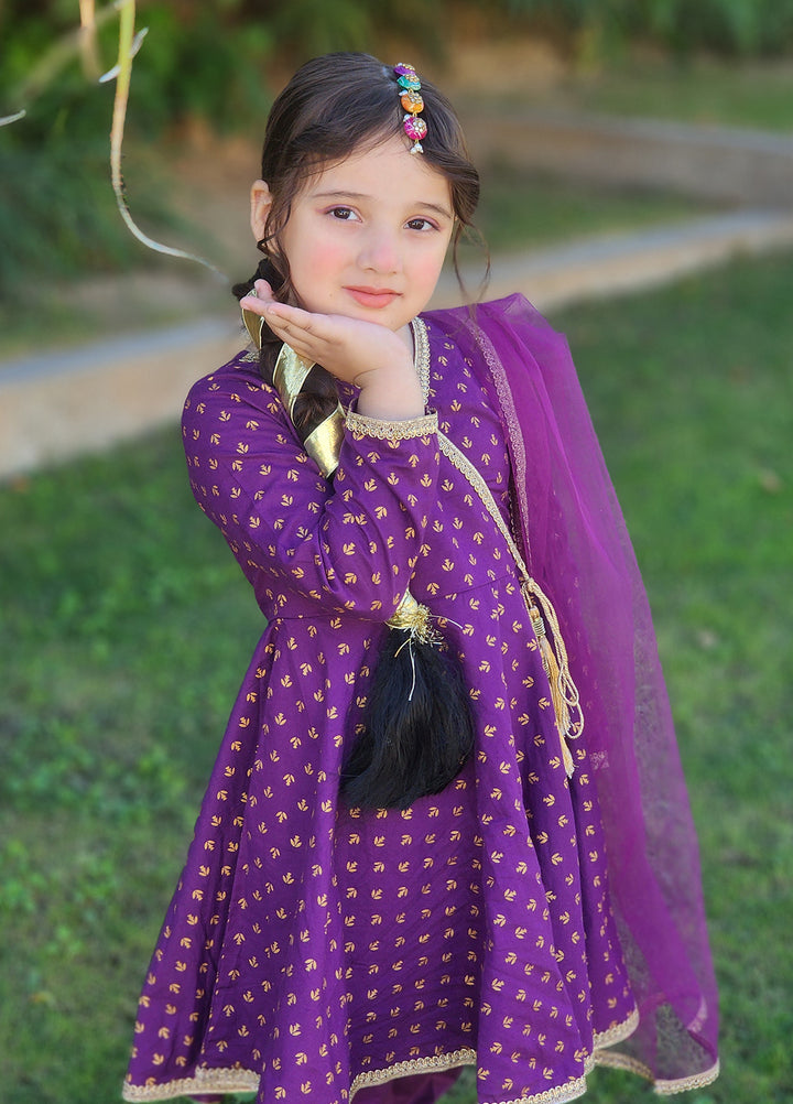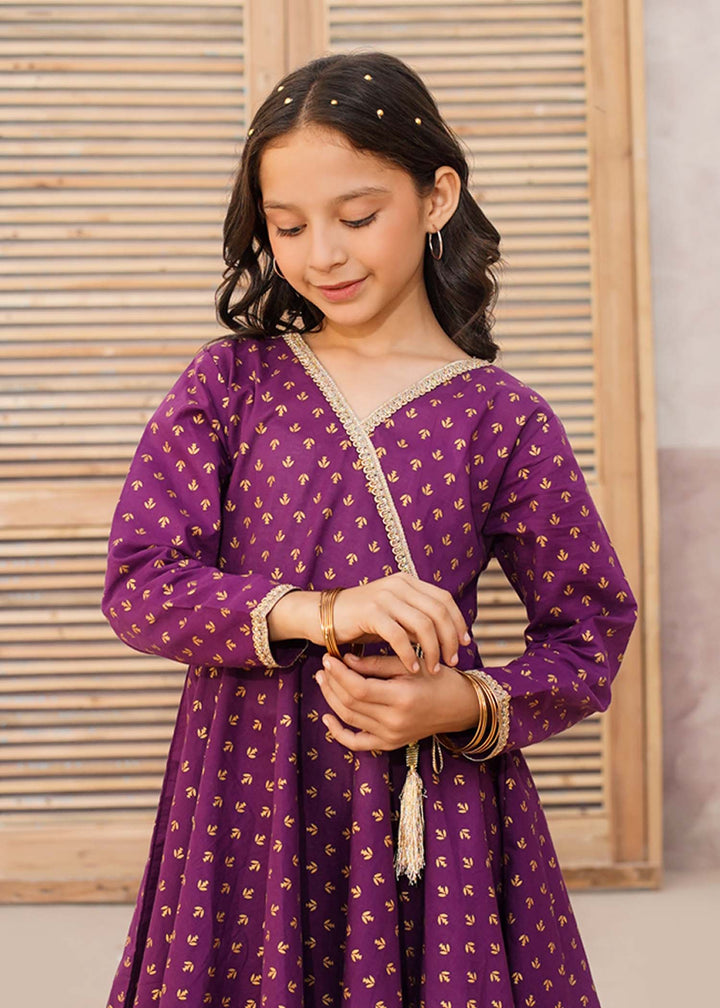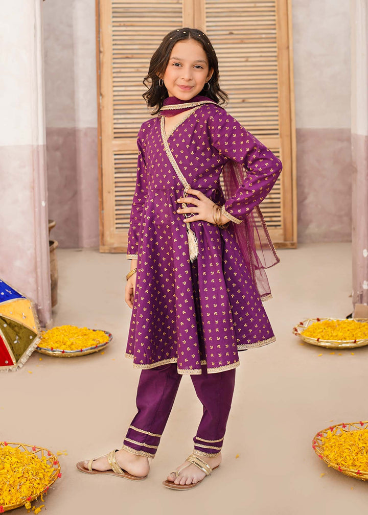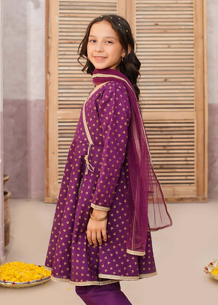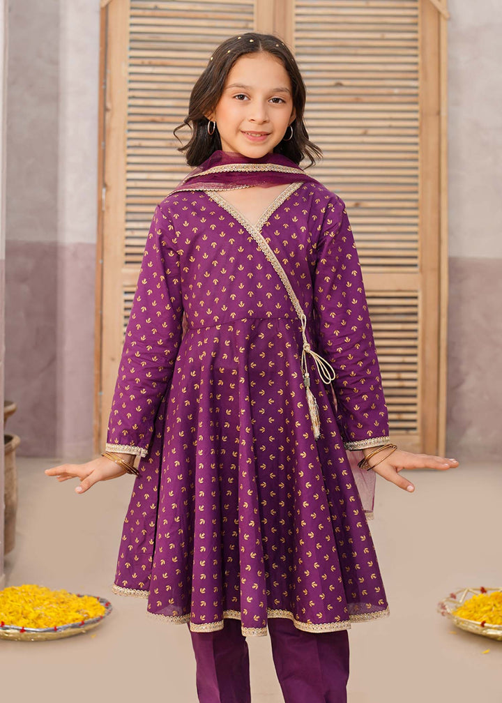 Add a touch of elegance to your little girl’s festive wardrobe with our Girls 3 Piece Printed Suit — a beautifully crafted 3-piece cotton dress for girls, perfect for weddings, Eid, birthdays, and formal family gatherings. Made from premium cotton fabric, this outfit features delicate print with golden lace that makes it both classy and comfortable. The rich purple color with golden accents adds a royal charm that’s ideal for any celebration.