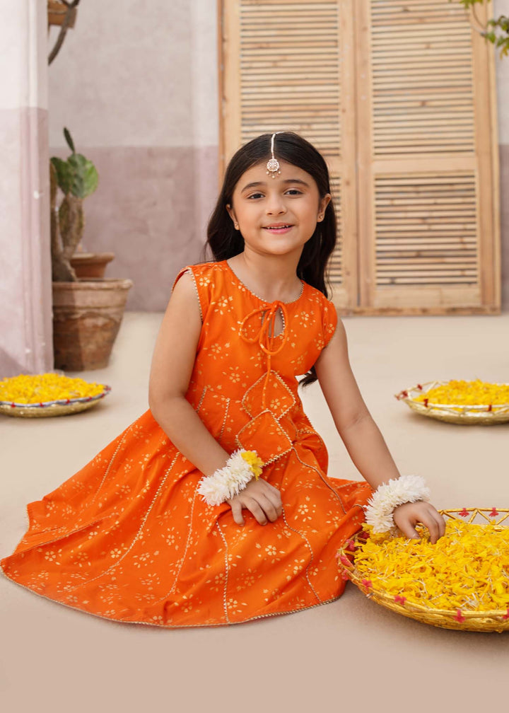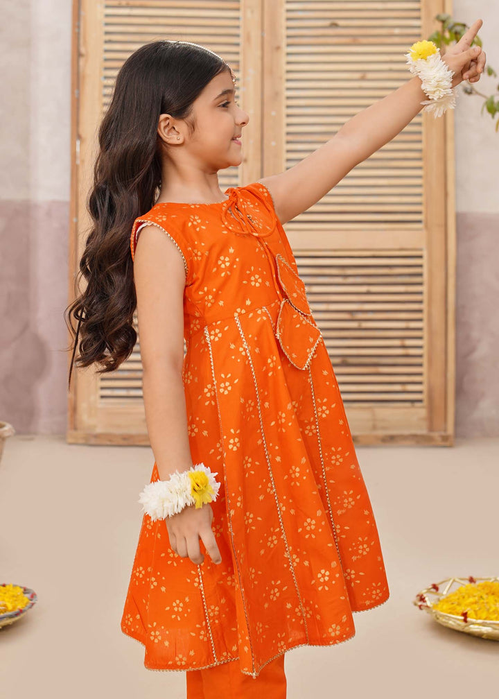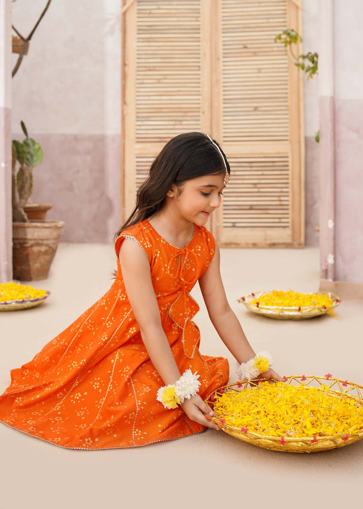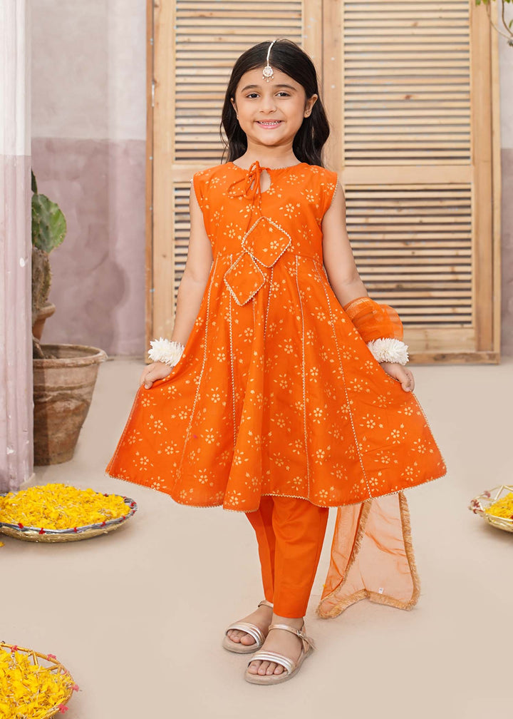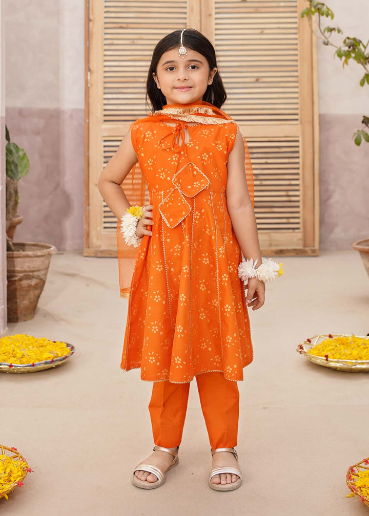 Add a touch of elegance to your little girl’s festive wardrobe with our Girls Printed Cotton Suit — a beautifully crafted 3-piece dress for girls, perfect for weddings, Eid, birthdays, and formal family gatherings. Made from premium cotton fabric, this outfit features delicate print with golden lace on dupatta that makes it both classy and comfortable. The rich orange color with golden accents adds a royal charm that’s ideal for any celebration.