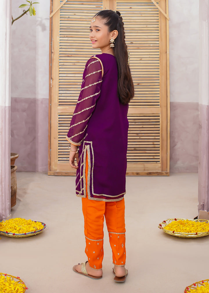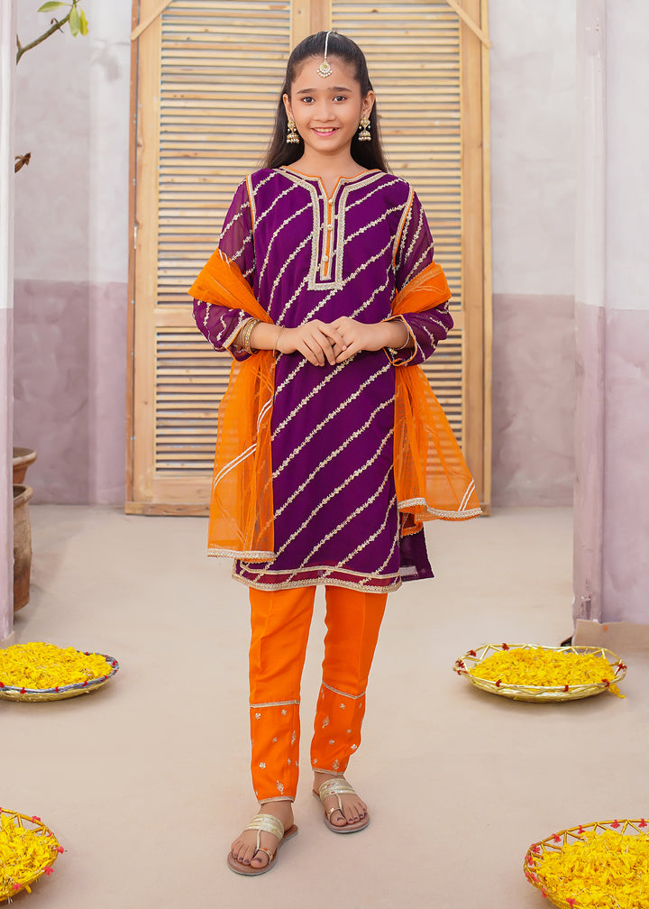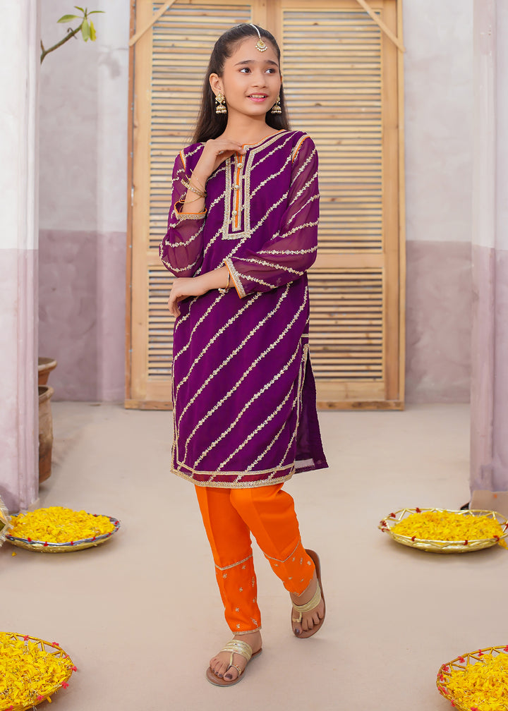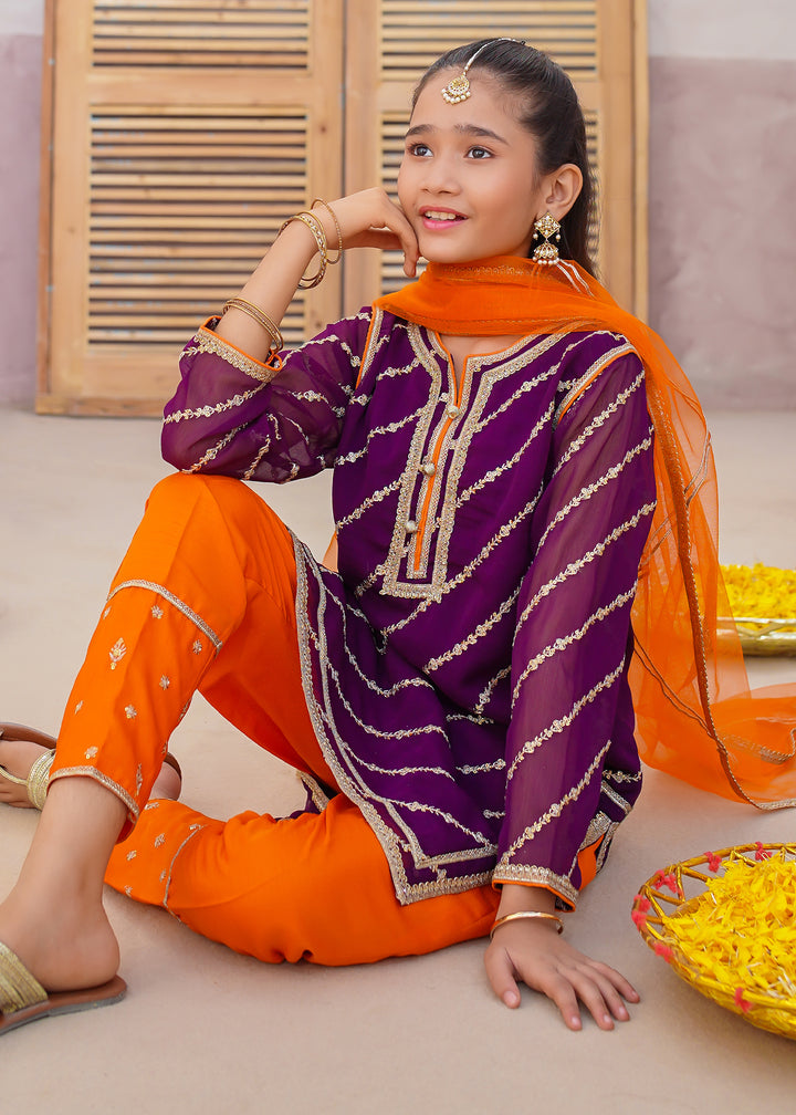 Add a touch of elegance to your little girl’s festive wardrobe with our Girls Embroidered Chiffon Suit — a beautifully crafted 3-piece dress for girls, perfect for weddings, Eid, birthdays, and formal family gatherings. Made from premium chiffon fabric, this outfit features delicate embroidery with golden lace detailing that makes it both classy and comfortable. The rich purple color with golden accents adds a royal charm that’s ideal for any celebration.
