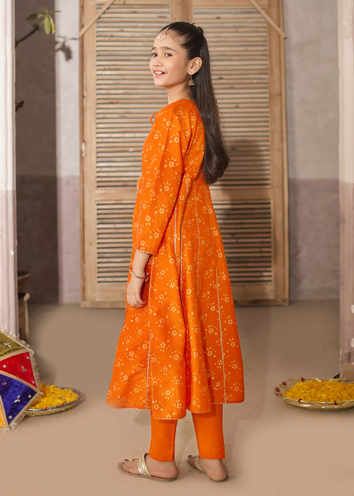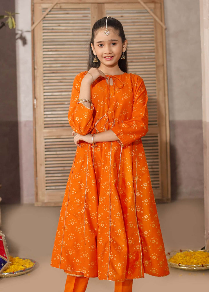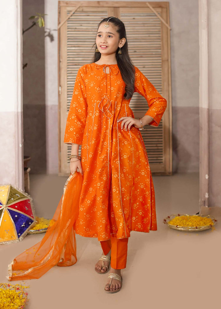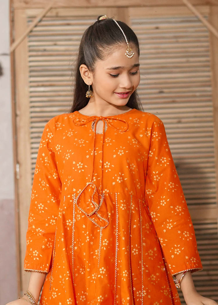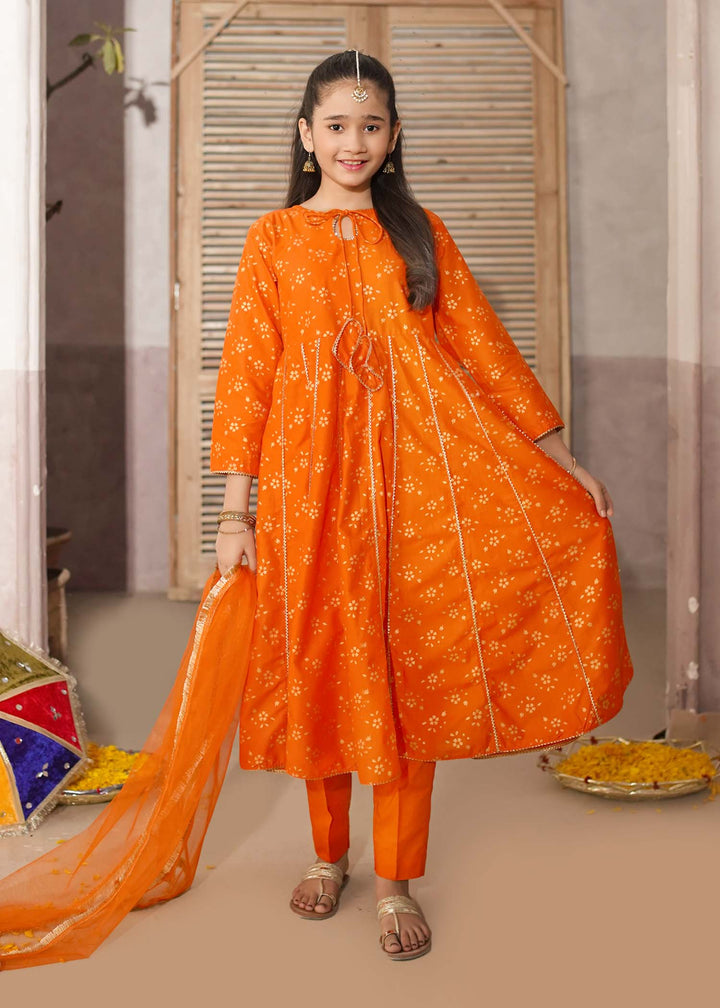 Add a touch of elegance to your little girl’s festive wardrobe with our Girls Printed Cotton Suit — a beautifully crafted 3-piece dress for girls, perfect for weddings, Eid, birthdays, and formal family gatherings. Made from premium cotton fabric, this outfit features delicate print with golden lace on dupatta that makes it both classy and comfortable. The rich orange color with golden accents adds a royal charm that’s ideal for any celebration.