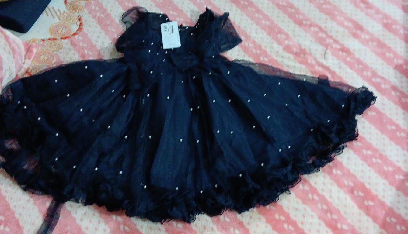 Detailing: A princess frock with a voluminous bottom skirt and pearl embellishments all over the ensemble.